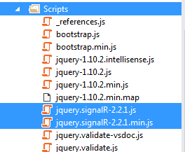 Script references. The jQuery library is required and is referenced by default in _Layout.cshtml Reference the SignalR library.