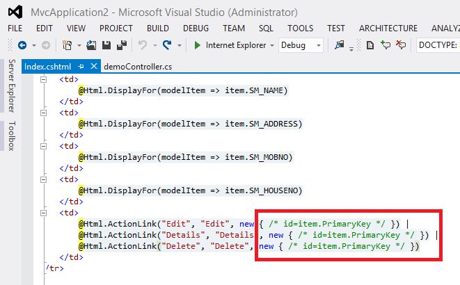 Look at the URL in the above image. The URL is requesting a view/page to edit the record but unfortunately the page is not found. Actually the page/view is already there but the problem is, we are not supplying the correct ID or say index to edit. In other words we need an URL something like http://localhost:25349/demo/Edit/1 to edit the first record and http://localhost:25349/demo/Edit/2 to edit the second record. Yet in the preceding image we are not supplying the ID.